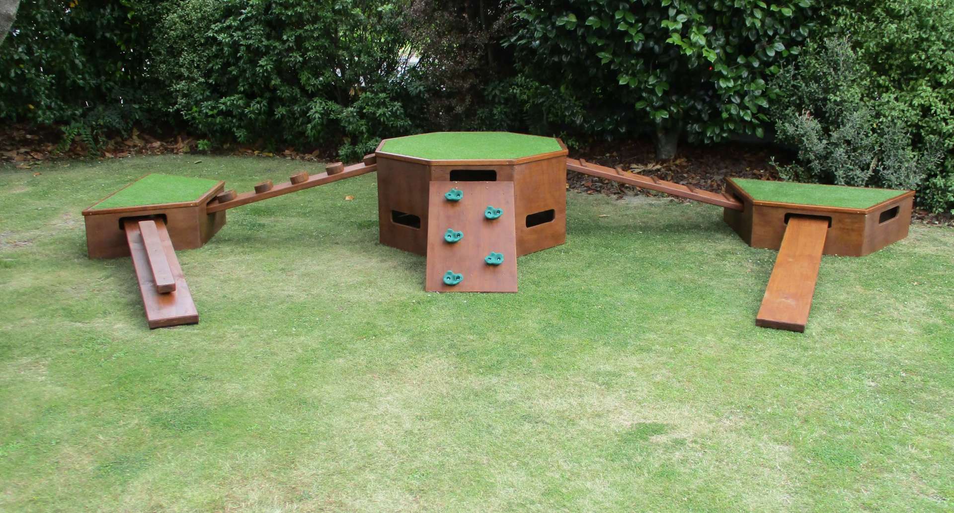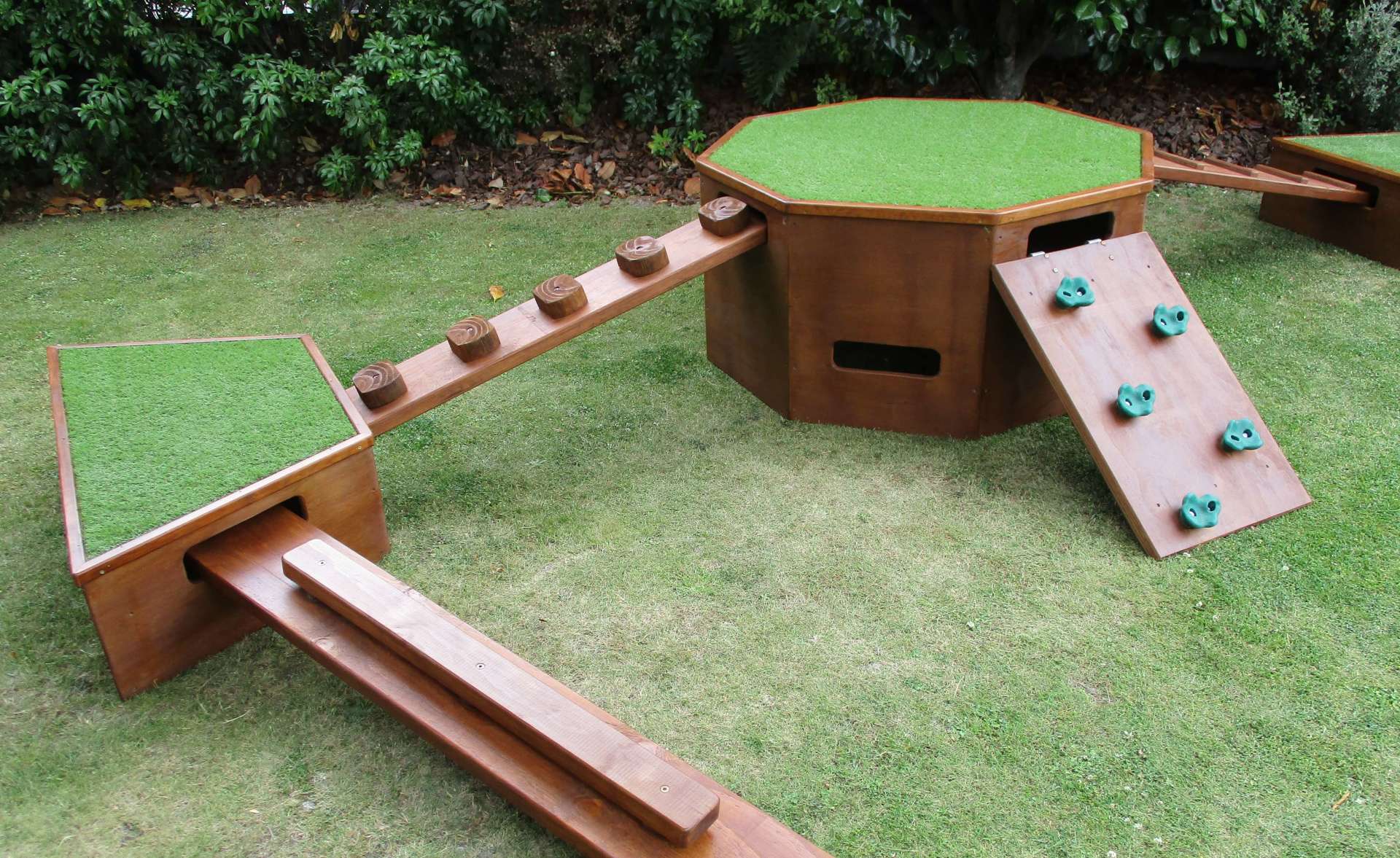 A fully interchangeable 8-piece outdoor play set, designed to encourage movement, creativity, and adventure in play spaces.